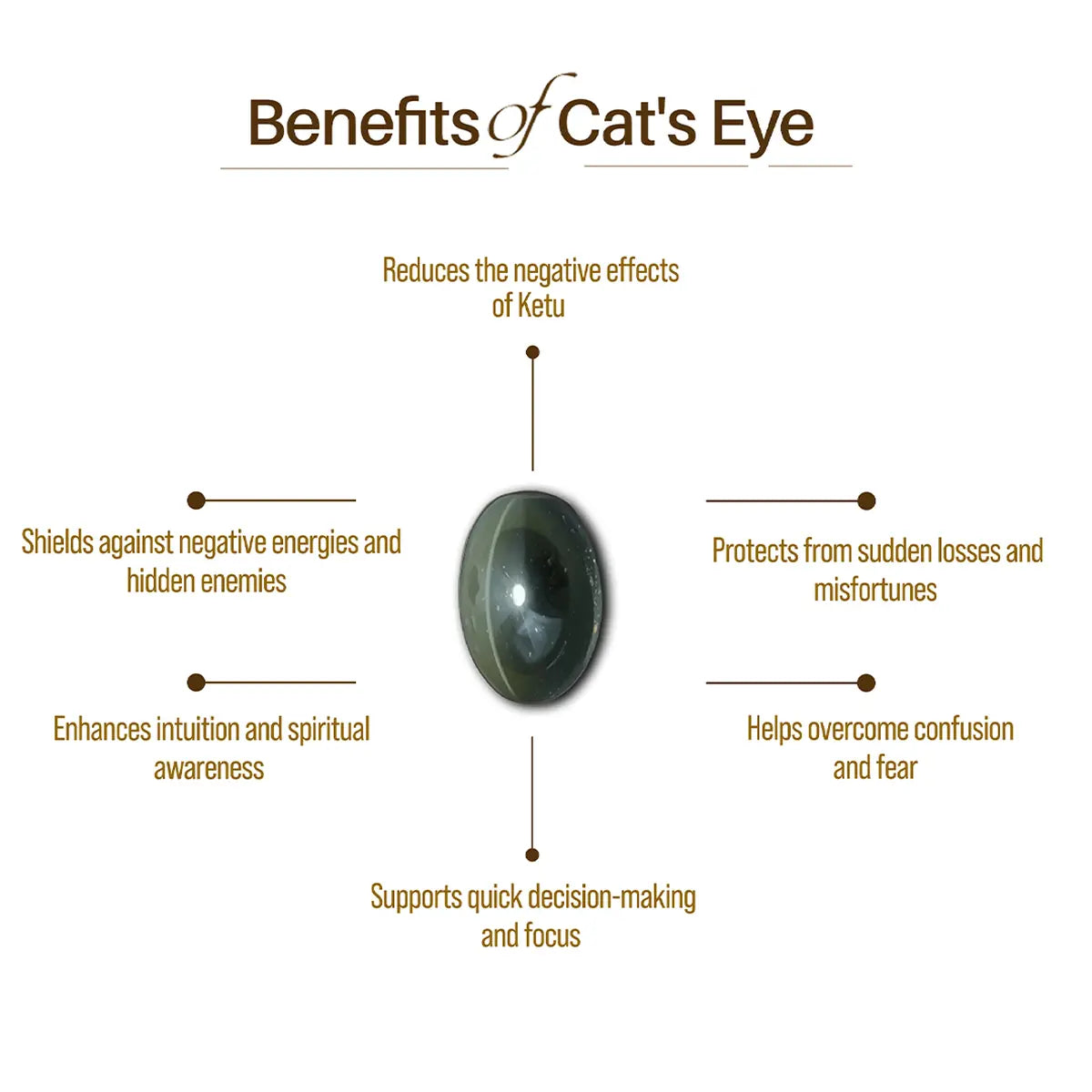 Cat’s Eye (Lehsunia) is a powerful astrological gemstone associated with the shadow planet Ketu. It is known for protecting the wearer from sudden losses, hidden enemies, and negative influences. Cat’s Eye helps bring clarity, spiritual awareness, and stability during uncertain or challenging phases of life. This gemstone is often recommended for individuals experiencing unexpected obstacles, confusion, or instability.