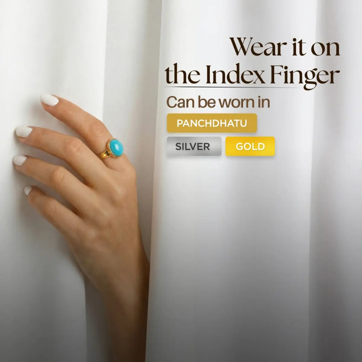 Turquoise (Firoza) is a protective and healing gemstone known for bringing peace, positivity, and good fortune. It is believed to safeguard the wearer from negative energies, emotional stress, and sudden misfortunes. Turquoise helps improve confidence, communication, and emotional balance. This gemstone is often recommended for people seeking protection, mental calmness, and overall well-being.